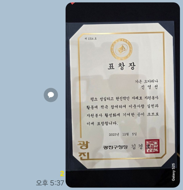 2025년 12월 5일 광진구 자원봉사자의 날 신영선 선생님께서 가온 오카리나 자원봉사와 이웃사랑을 실천…